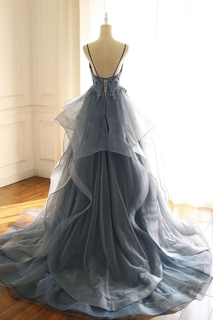 SP1015,Blue Gray Tulle V Neck Long Ruffles Prom Dress,Lace Evening Dress