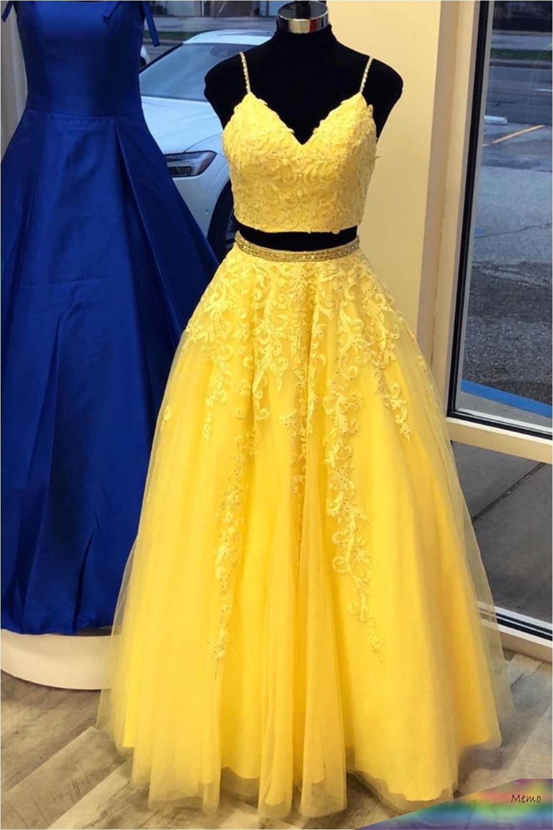 SP1076,Two Pieces Yellow Prom Dresses,Long Applique Evening Dress with Beaded