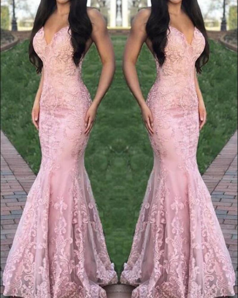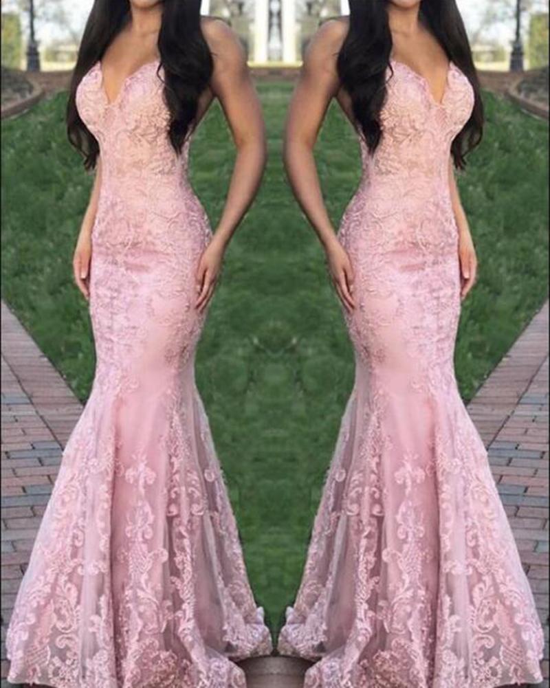 SP1094,Light Pink Mermaid Lace V-Neck Long Prom Dresses Formal Evening Gowns