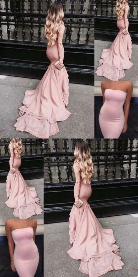SP1095,Light Pink Prom Dresses Mermaid Strapless Satin Bodycon Evening Gowns With Court Train Tight Long Special Occasions Dress