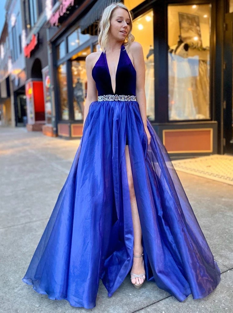 SP1102,Royal blue organza prom dress,v-neck beaded evening party dresses