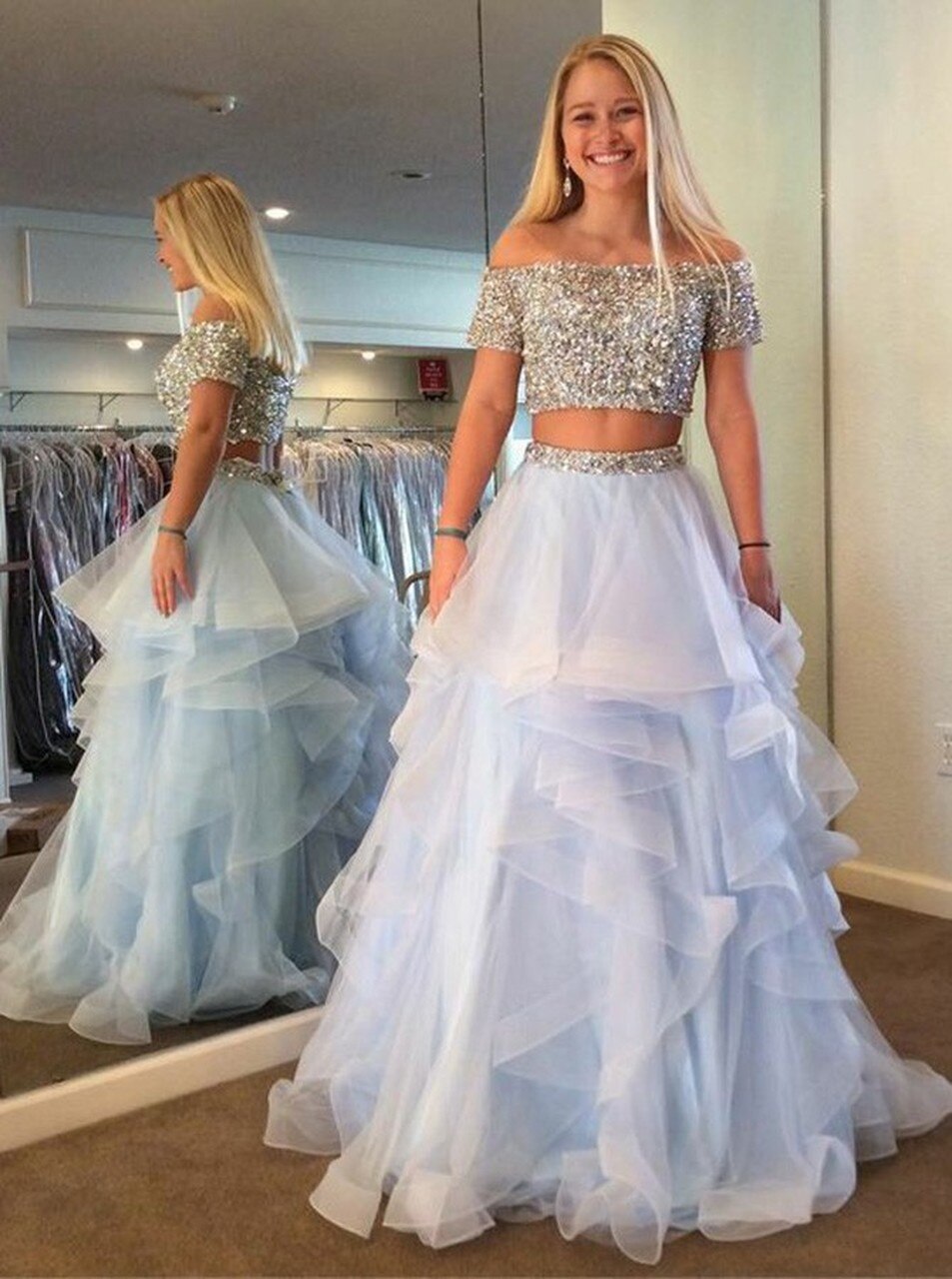 SP1133,Two Piece Off-the-Shoulder Tiered Blue Tulle Prom Dress With Sequins Beading,Short Sleeves A-Line Evening Dresses,Prom Dresses