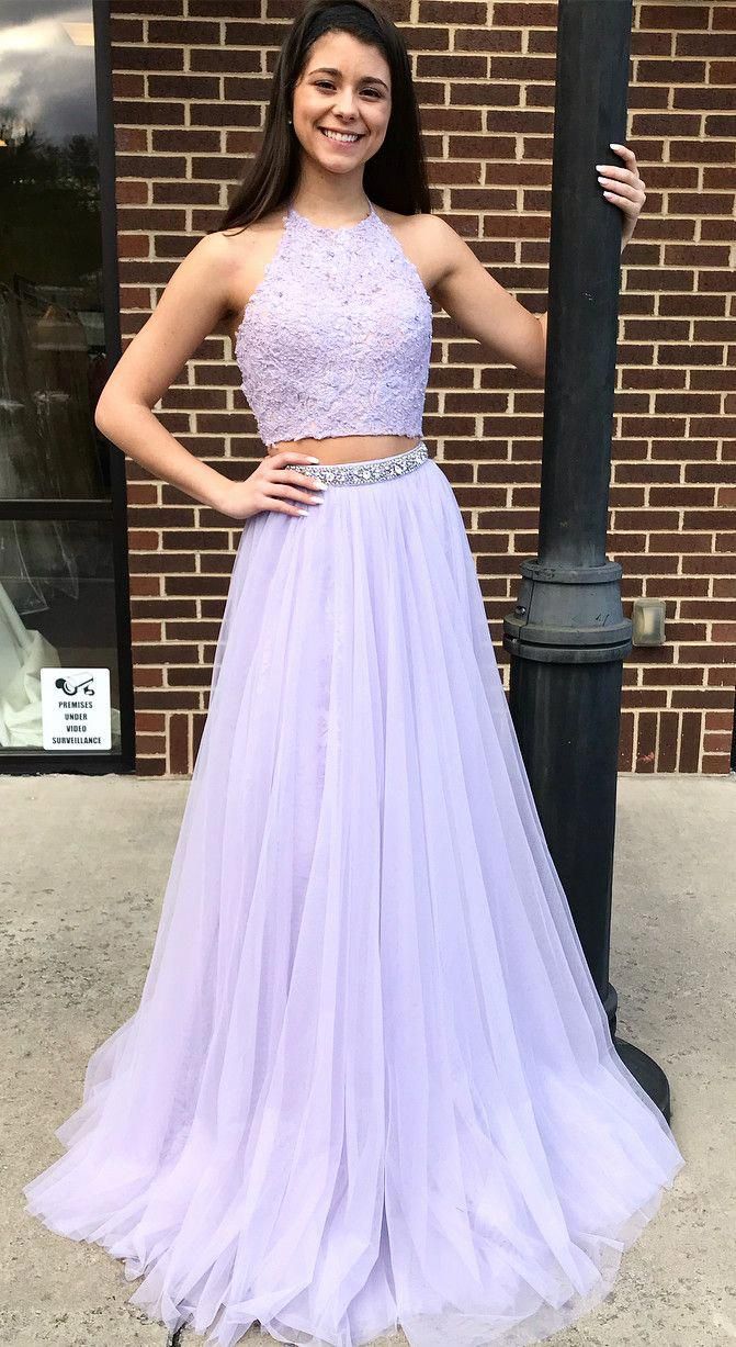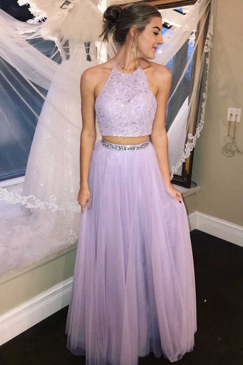 SP1134,Elegant Prom Dresses,Lavender Prom Dress,Two Piece Prom Dresses,Halter Prom Gown,Lace Prom Dress,Beading Evening Dress
