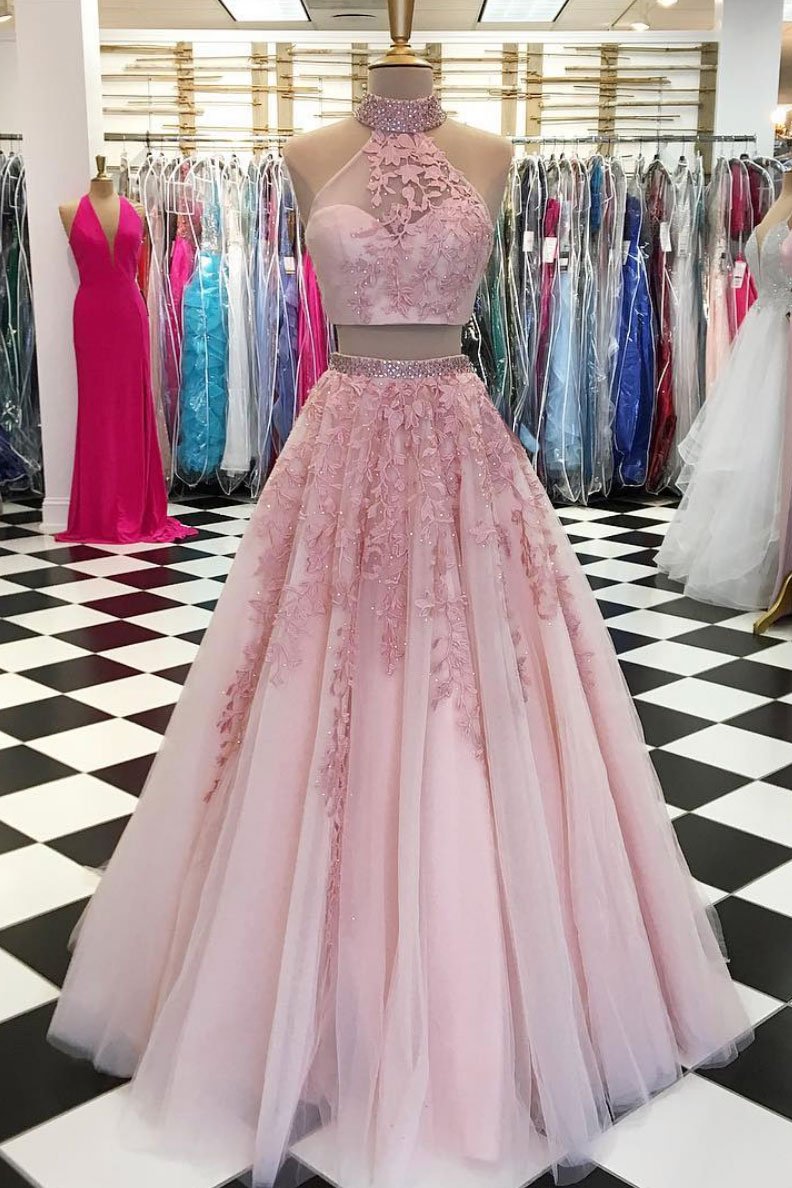 SP1135,Pink tulle two pieces long strapless prom dress, long beaded neck lace homecoming dress