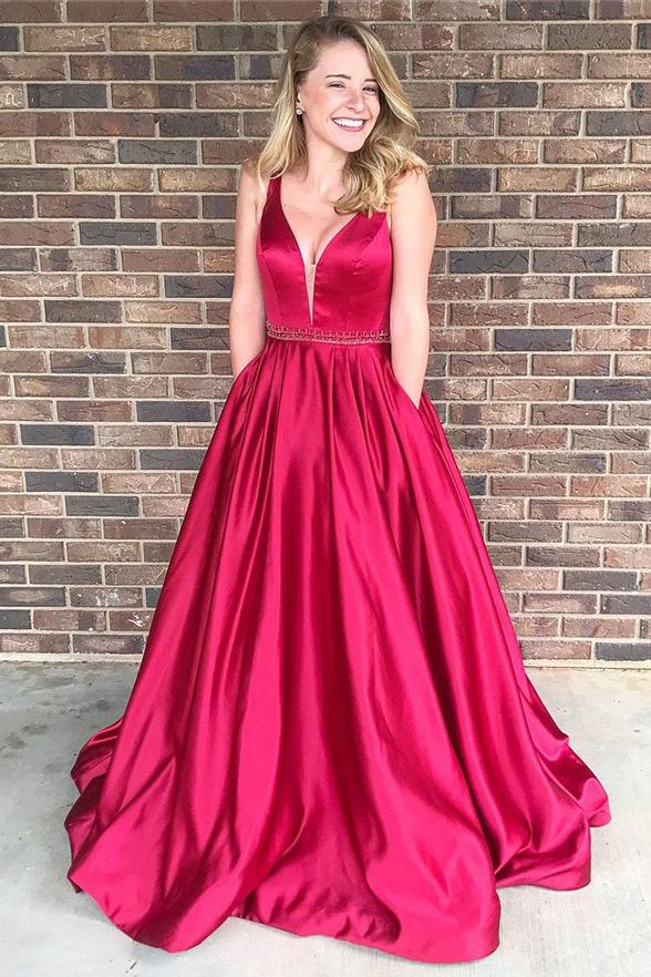 SP1161,A Line Princess V Neck Hot Pink Satin Prom Dresses Evening Gown Party Dress With Pocket