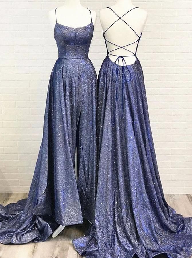 SP1165,Simple Blue Satin Sweep Train Backless Lace Up Prom Dress,Evening Dress