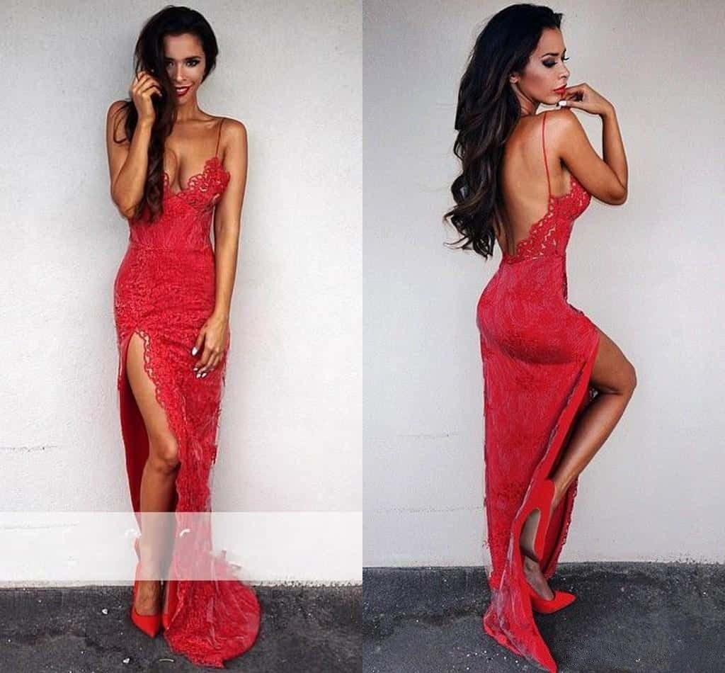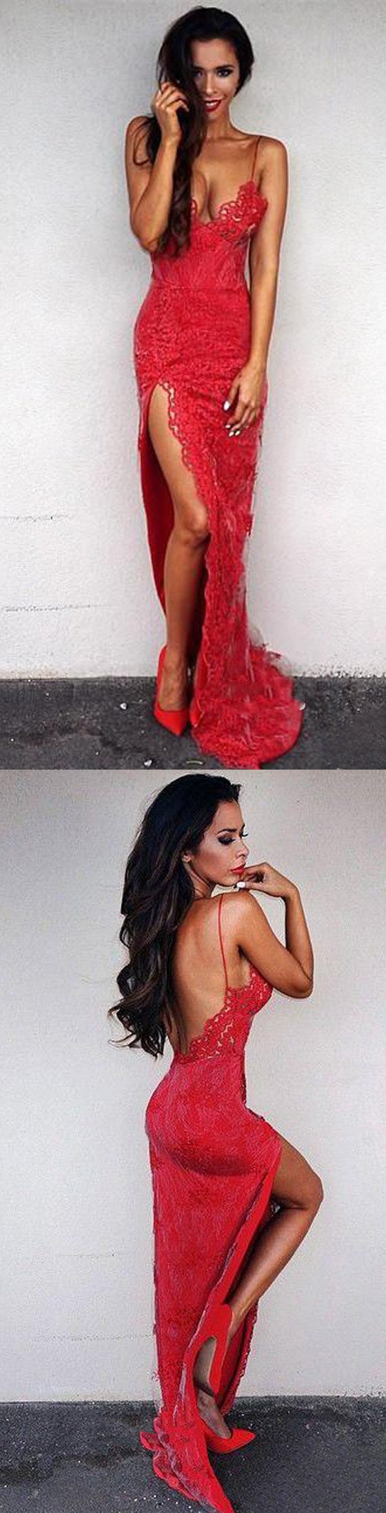 SP1376,Sexy Slit Prom Dress, Spaghetti Straps Red Lace Graduation Dress