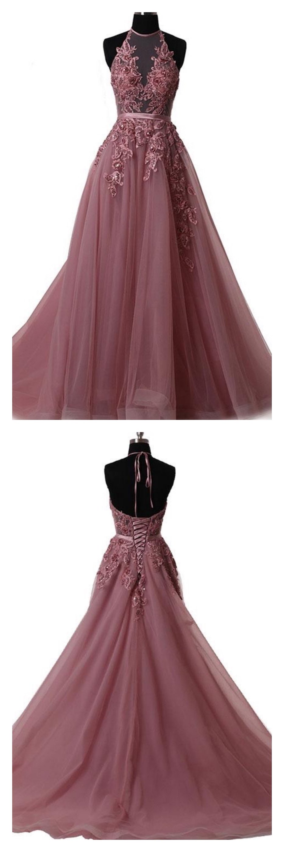 SP1378,2021 Long Sweep Train Halter Dazzling Top Tulle Modest Prom Dress
