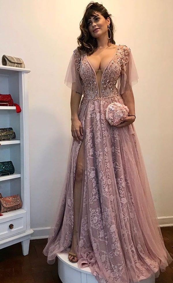 SP1470,Vestido Pink Lace Deep V-Neck Long Sheath Prom Dresses
