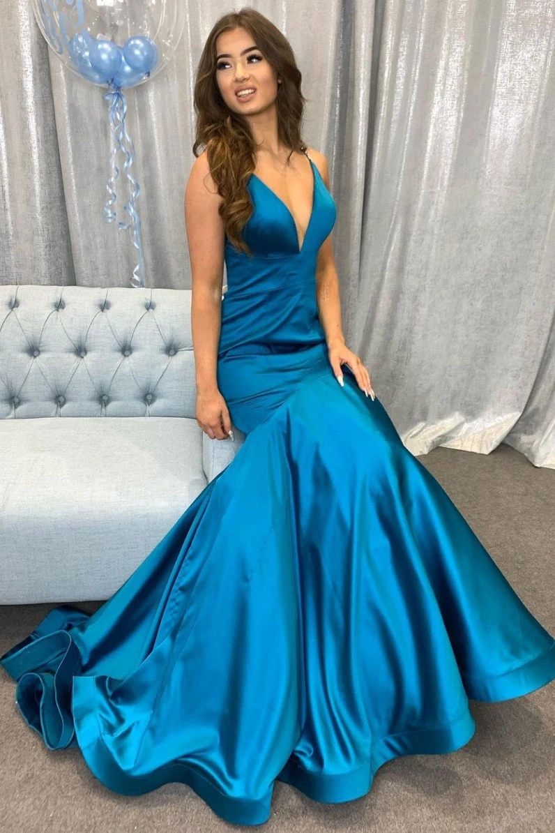 SP1485,Simple v neck peacock blue satin mermaid long prom dress trumpet blue evening dress