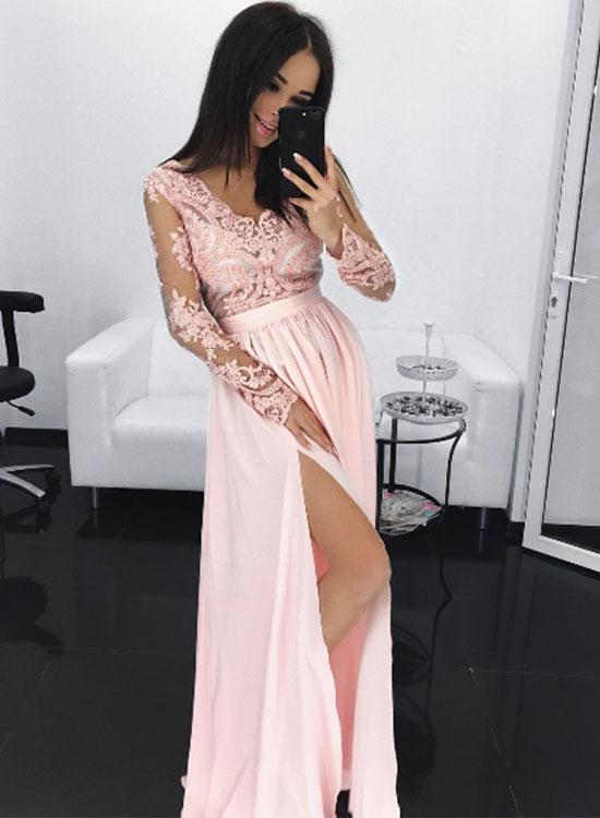 SP1492,Pink Lace Evening Dresses,Long Sleeves Party Dress