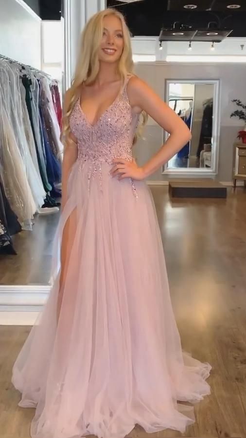 SP1499,Light pink tulle beaded prom dresses side slit long evening dress