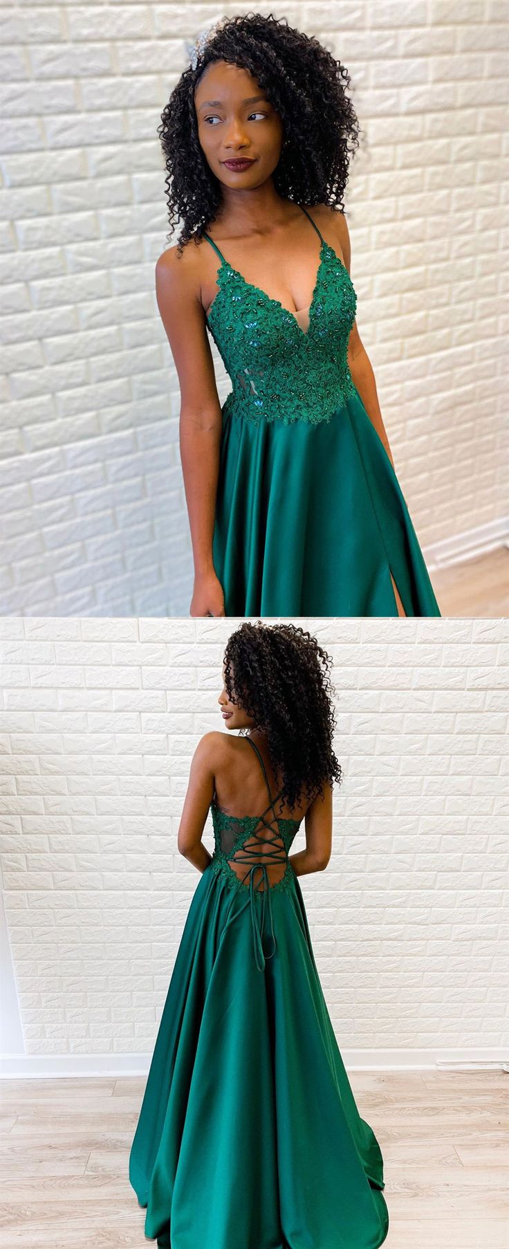 SP1521,Green Spaghetti Straps Long Prom Dresses Applique Beaded Evening Dresses