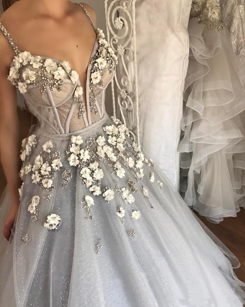 SP1588,Grey floral ball gown beaded sweetheart tulle prom dress