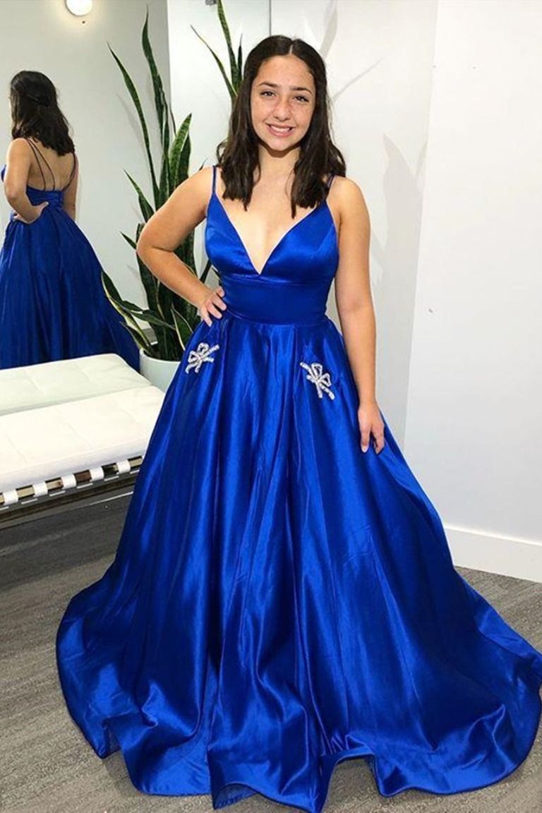 SP1633,V Neck Royal Blue Satin Long Prom Dresses with Pocket,Royal Blue Formal Evening Dresses