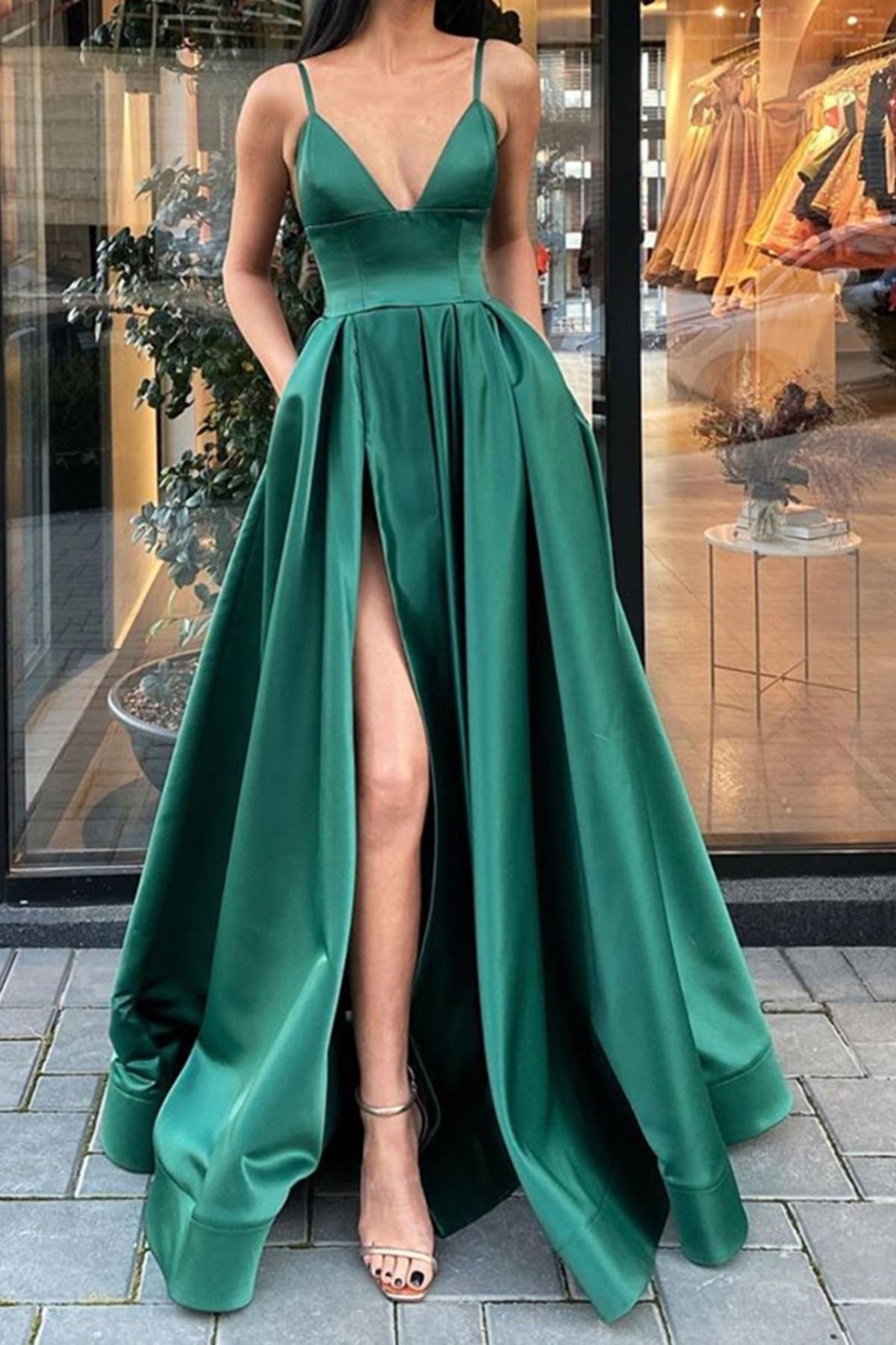 SP1708,A Line V Neck Dark Green Long Prom Dresses with Leg Slit, High Slit Green Formal Evening Dresses