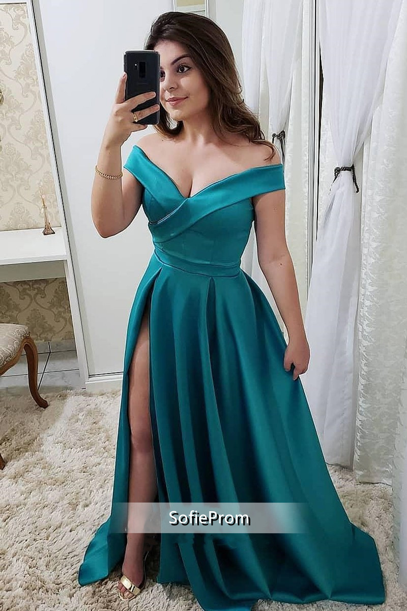 SP1783,Off the shoulder cheap satin a line prom formal gown with side slit