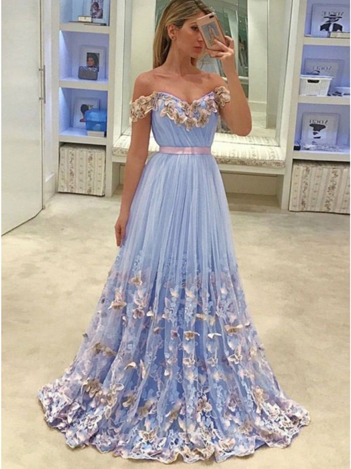 SP1958,Off-the-Shoulder Tulle Butterfly Appliques Long Prom Dresses