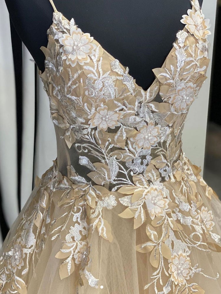 SP1960,Champagne V Neck Tulle Lace Long Prom Dress Beaded Applique Evening Dress