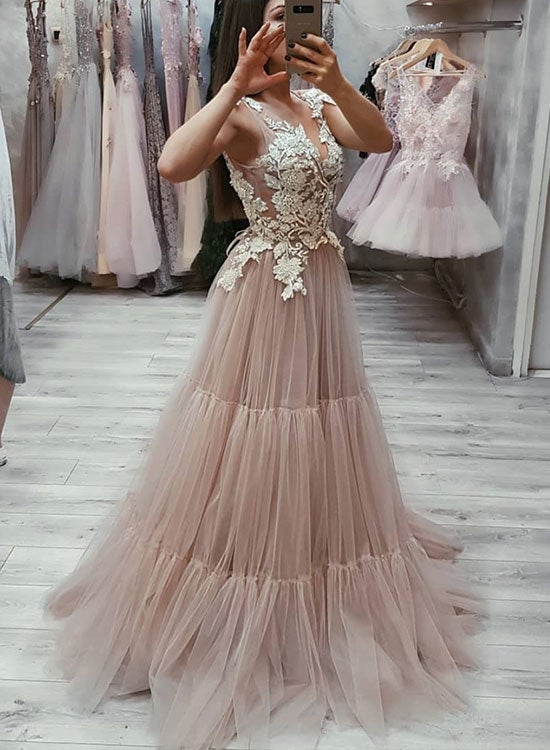 SP1963,A-line V-neck Prom Dresses With Appliques Tulle Formal Dress