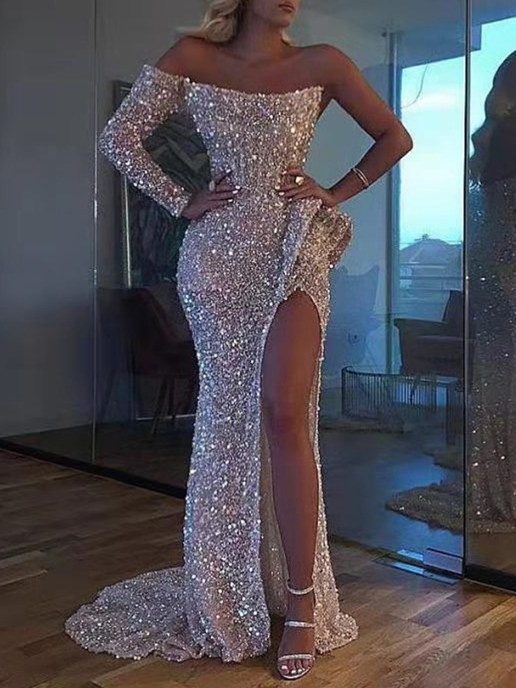 SP2006,Sexy white sequin prom dresses high split long evening dress one shoulder party dresses