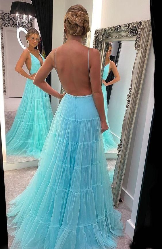 SP2041,Fairy A Line V Neck Spaghetti Straps Lake Blue Tulle Prom Dresses