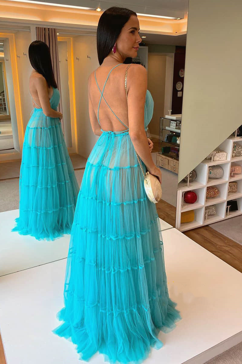 SP2051,A-line Spaghetti Straps V-neck Sky Blue Tulle Long Formal Evening Dress