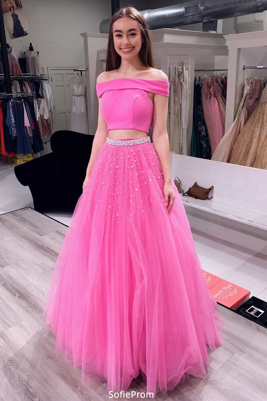 SP2070,Two pieces tulle prom dresses,beaded a-line long evening dress