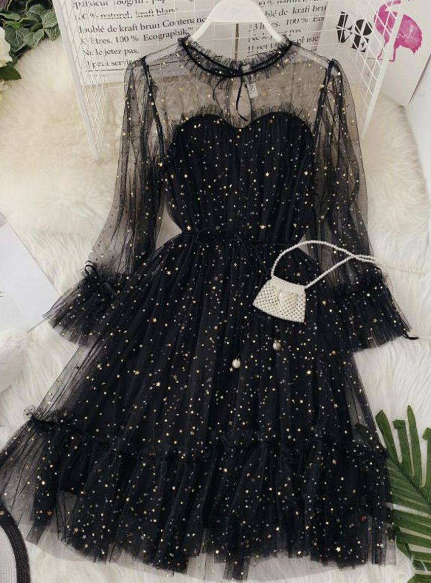 SP1519,Princess Black Starry Long Sleeves Tulle Ruffle Short Homecoming Dress,Mini Prom Evening Gown