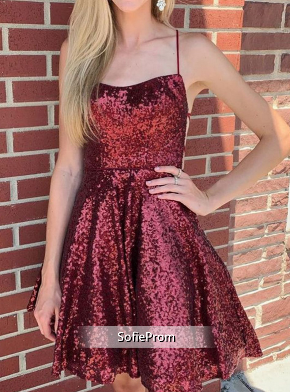 SP1858,A Line Burgundy Sequin Spaghetti Strap Short Prom Dress With Open Back