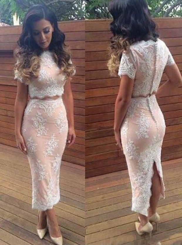 SP1891,Two-Piece Short Sleeve Ankle Length Lace Sheath Prom Dress With Split