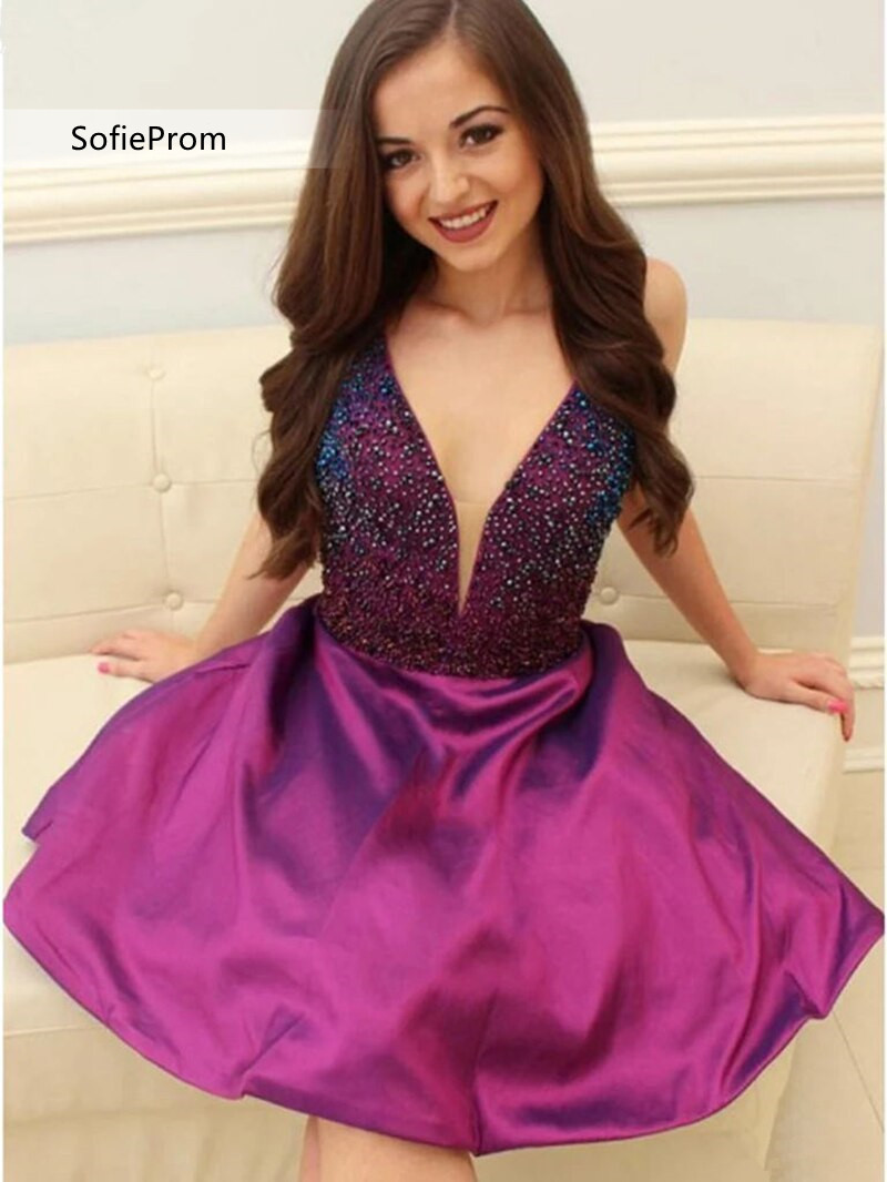 SP1905,A-line V-neck Beading Bodice Short Prom Homecoming Dress
