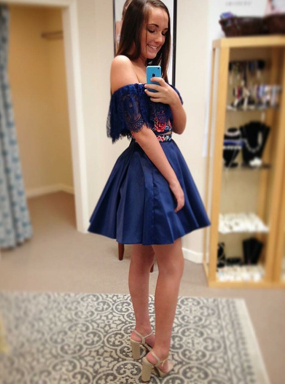 SP2150,Cute navy blue homecoming dresses,off the shoulder embroidery short prom dress,two pieces homecoming dresses,dark blue graduation dress
