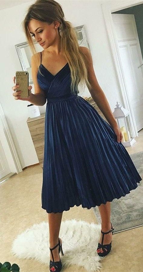 SP2151,Dark blue pleated midi dresses,tea length spaghetti straps homecoming dresses