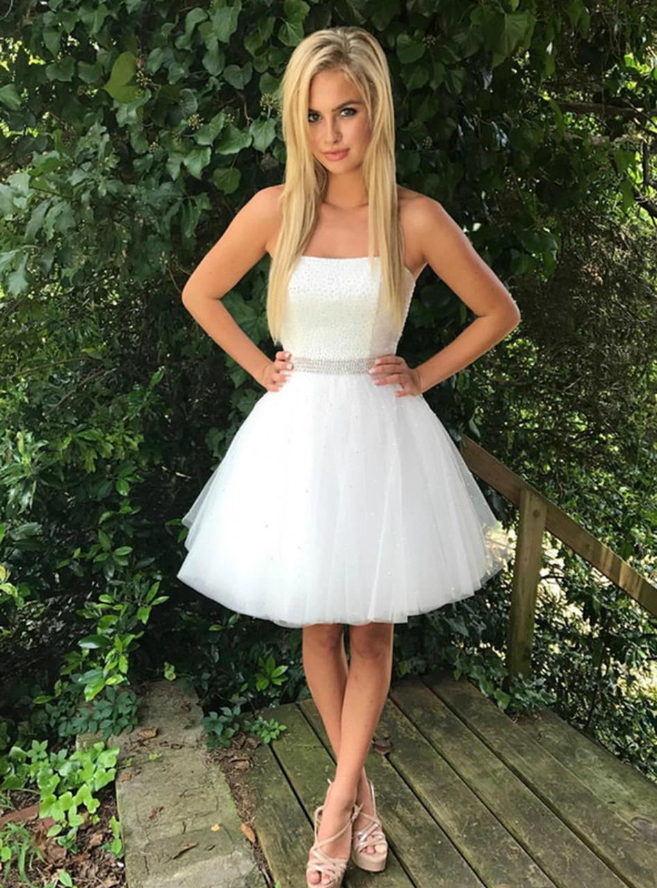 SP2160,White strapless homecoming dresses,beaded top tulle hoco graduation dress