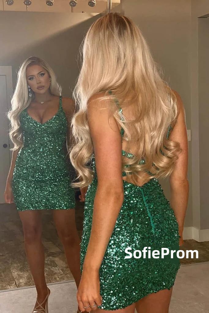 SP2204,Sexy Green Sequin Homecoming Dress,V-Neck Cheap Short Prom Dresses