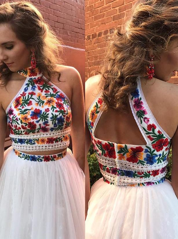 SP1842,Halter Sweet 16 Dress Two Piece Embroidery Floral Long Prom Dress