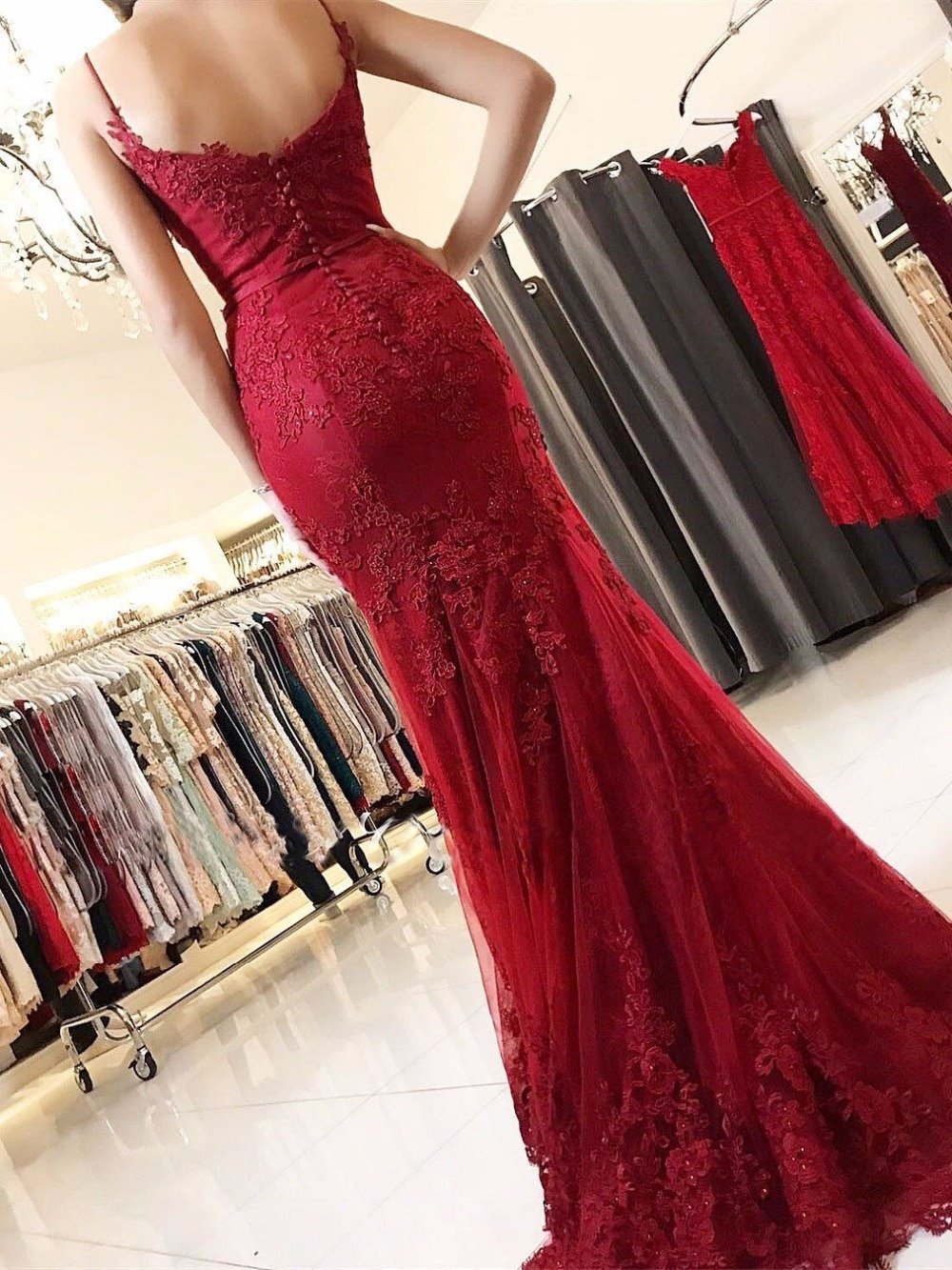 SP1943,Burgundy Spaghetti Straps Mermaid/Trumpet Long Lace Prom Dress