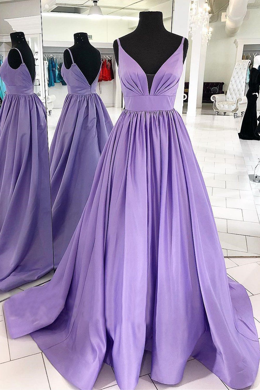 SP1950,Purple spaghetti straps long prom dress v-neck satin ball gown