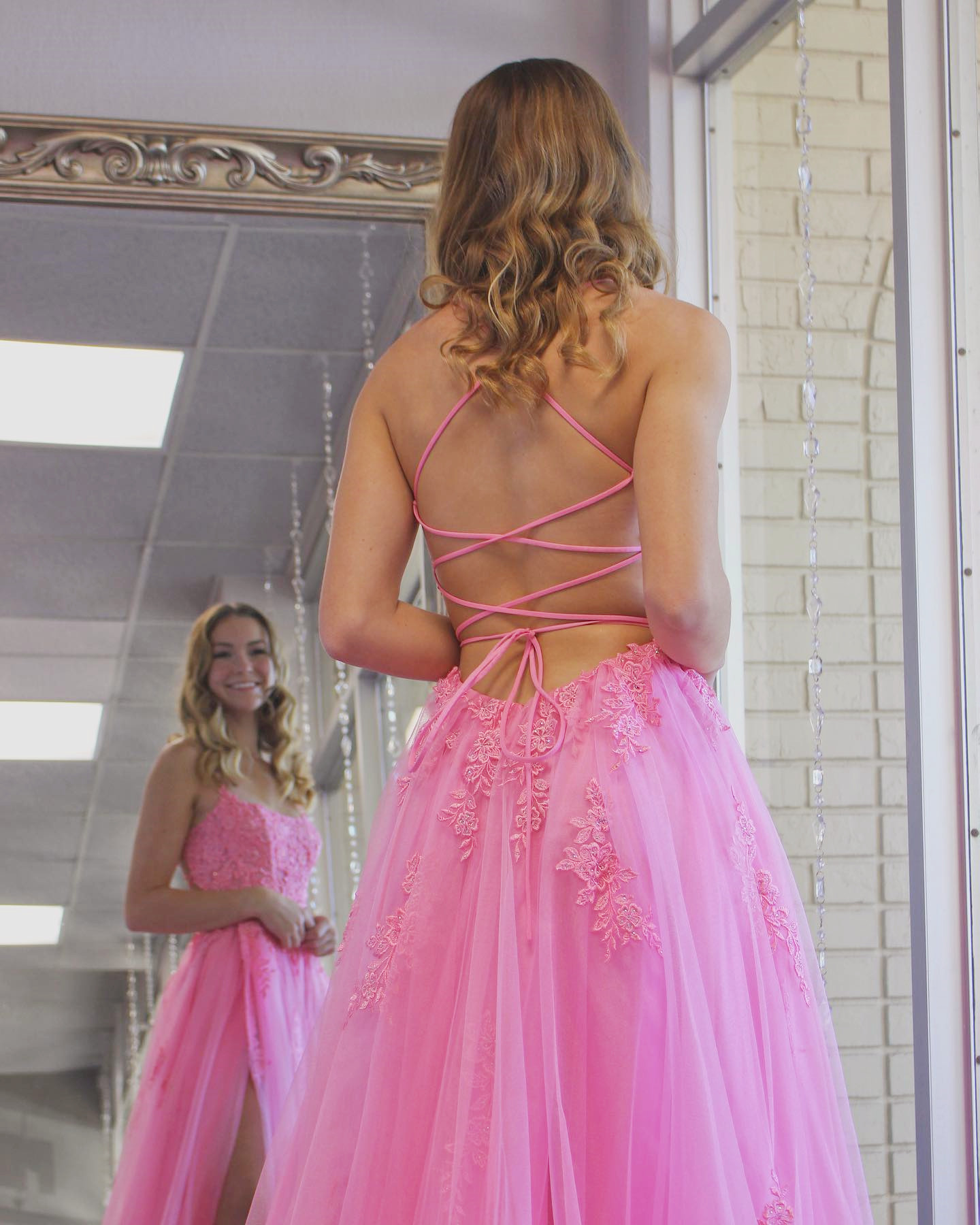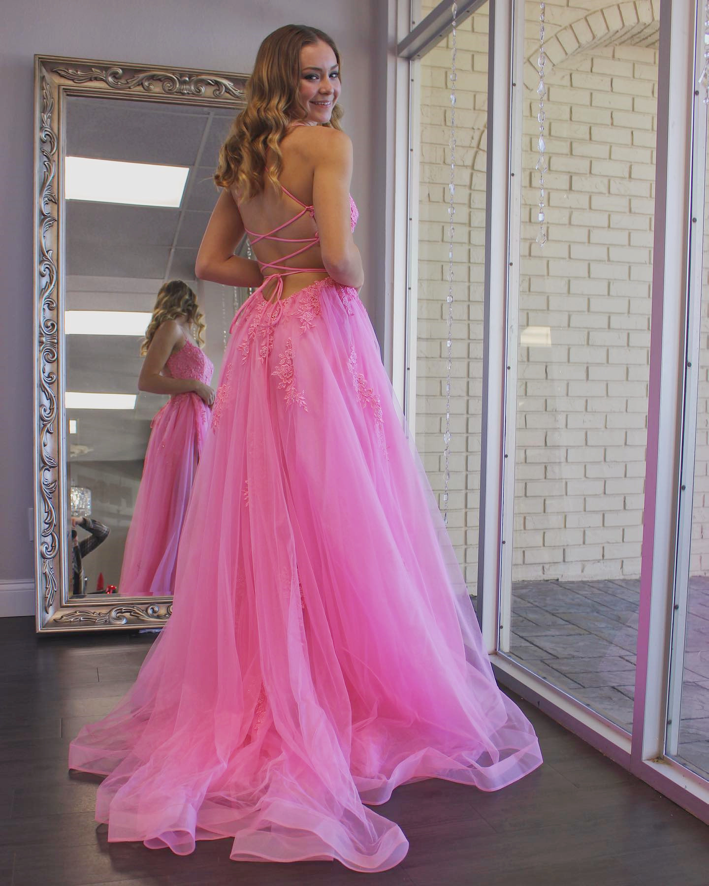 SP2002,Princess Lace Prom Dresses Applique Tulle Evening Dress Spaghetti Straps Criss-Back Princess Evening Dresses