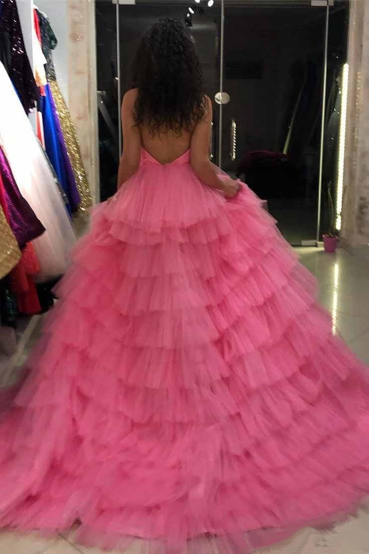 SP2089,High neck pink tulle prom dresses,open back tiered layers long evening dress