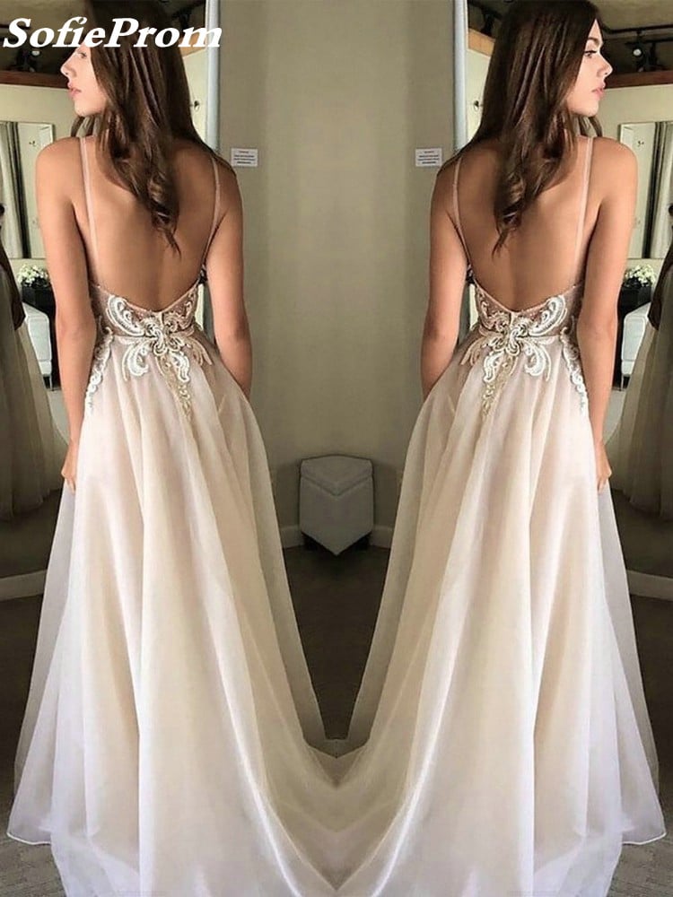 SP1394,Backless Spaghetti Straps A-line Organza Flowy Prom Dress Long,Light Pink V-Neck Wedding Gown,Organza Wedding Dress
