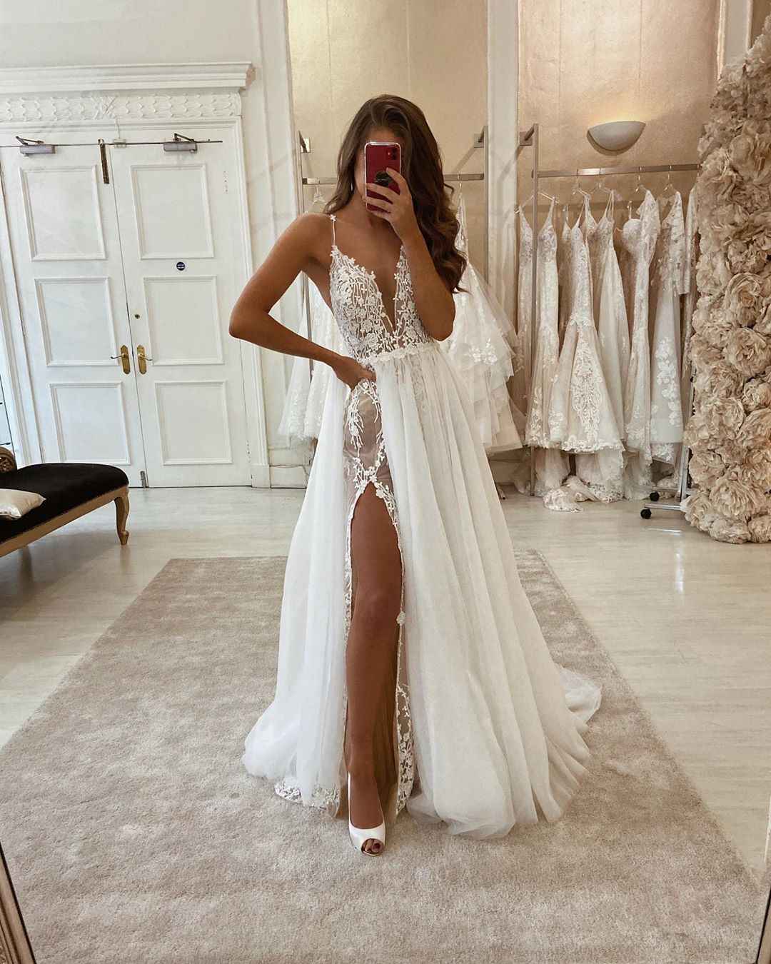 SP1527,2021 Elegant Spaghetti Straps V-Neck Applique Sheath Lace Tulle Wedding Dresses with High Split