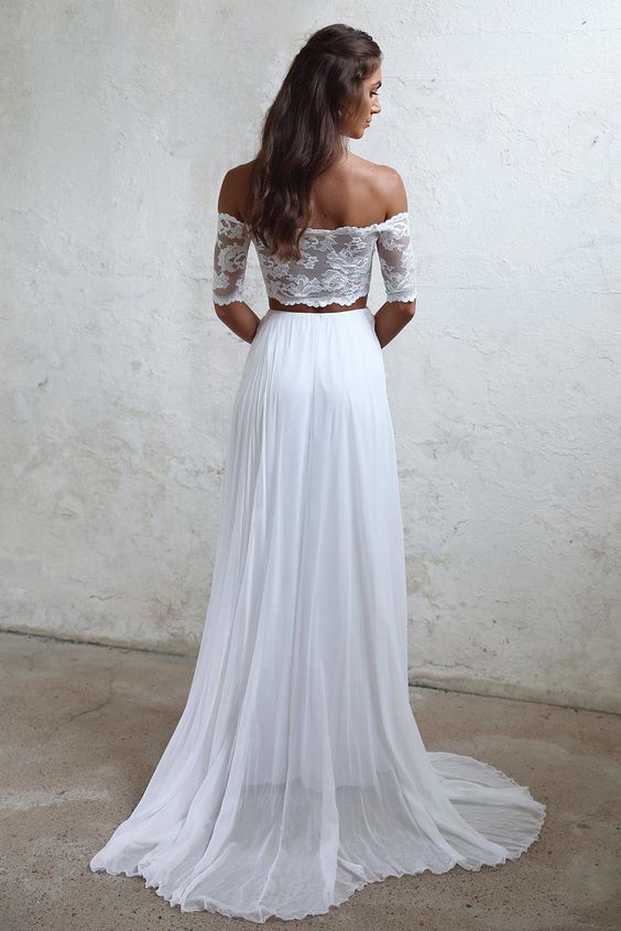 SP1581,Boho Two Piece Off the Shoulder Lace Chiffon Beach Wedding Dresses