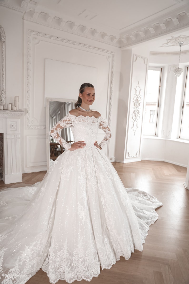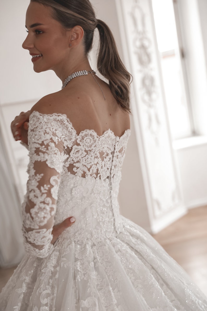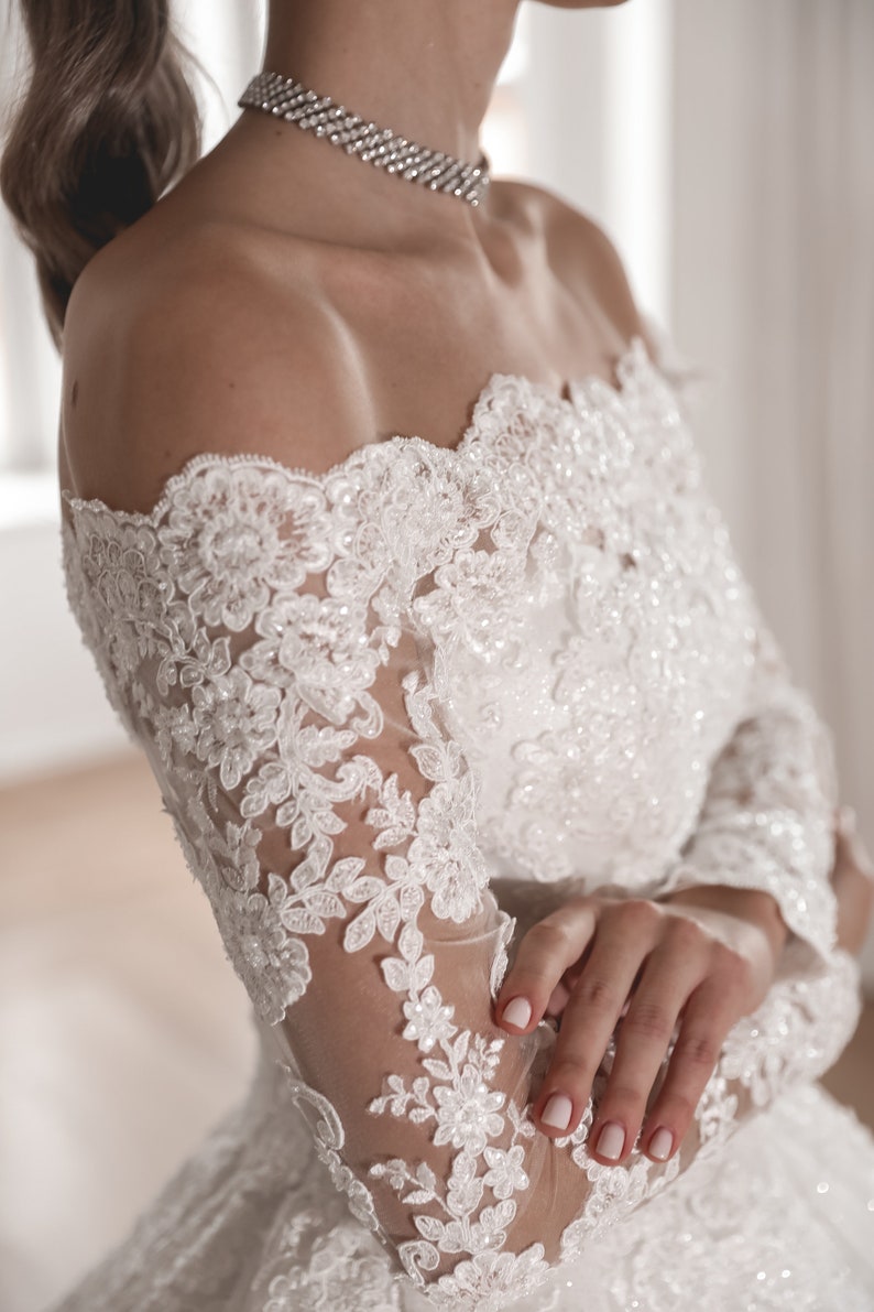 SP1769,White Applique Beaded A line Lace Wedding Gown