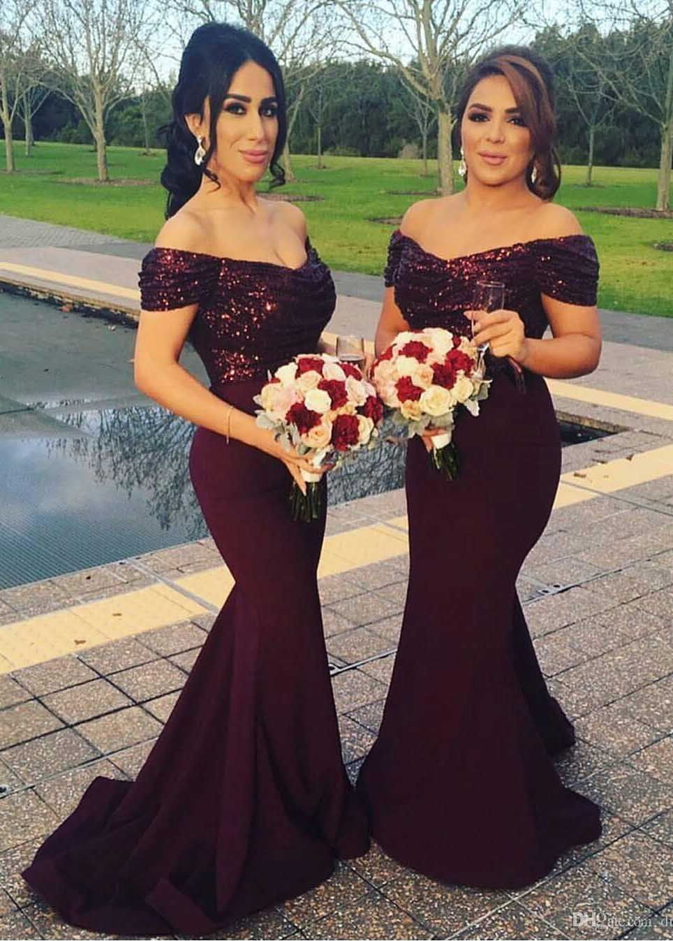 SP1552,Off Shoulder Mermaid Dark Red Bridesmaid Dresses with Sequins