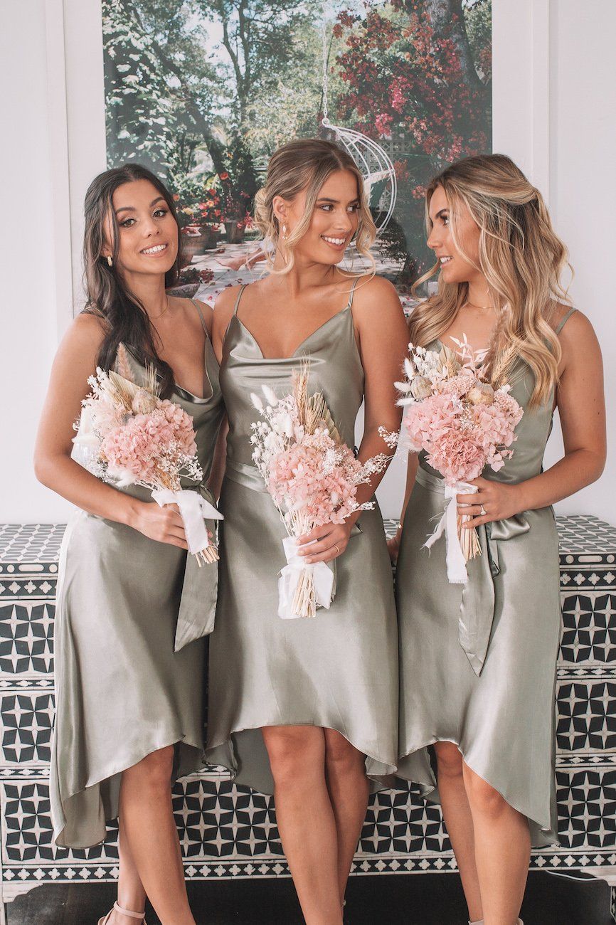 SP1623,Simple Sheath High Low Cowl Neck Olive green Silk Satin Bridesmaid Dresses